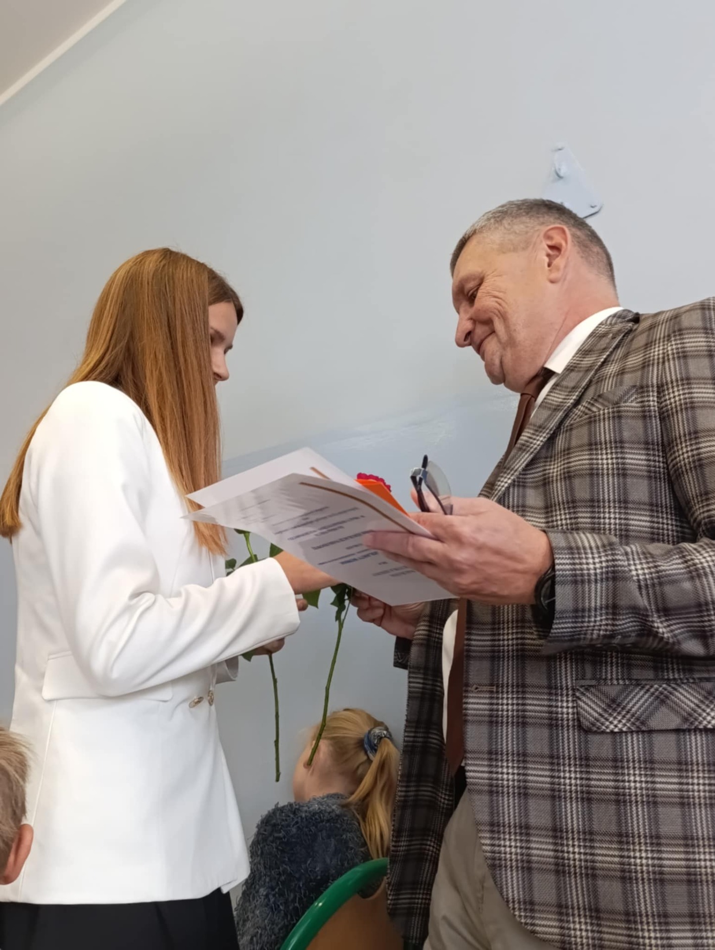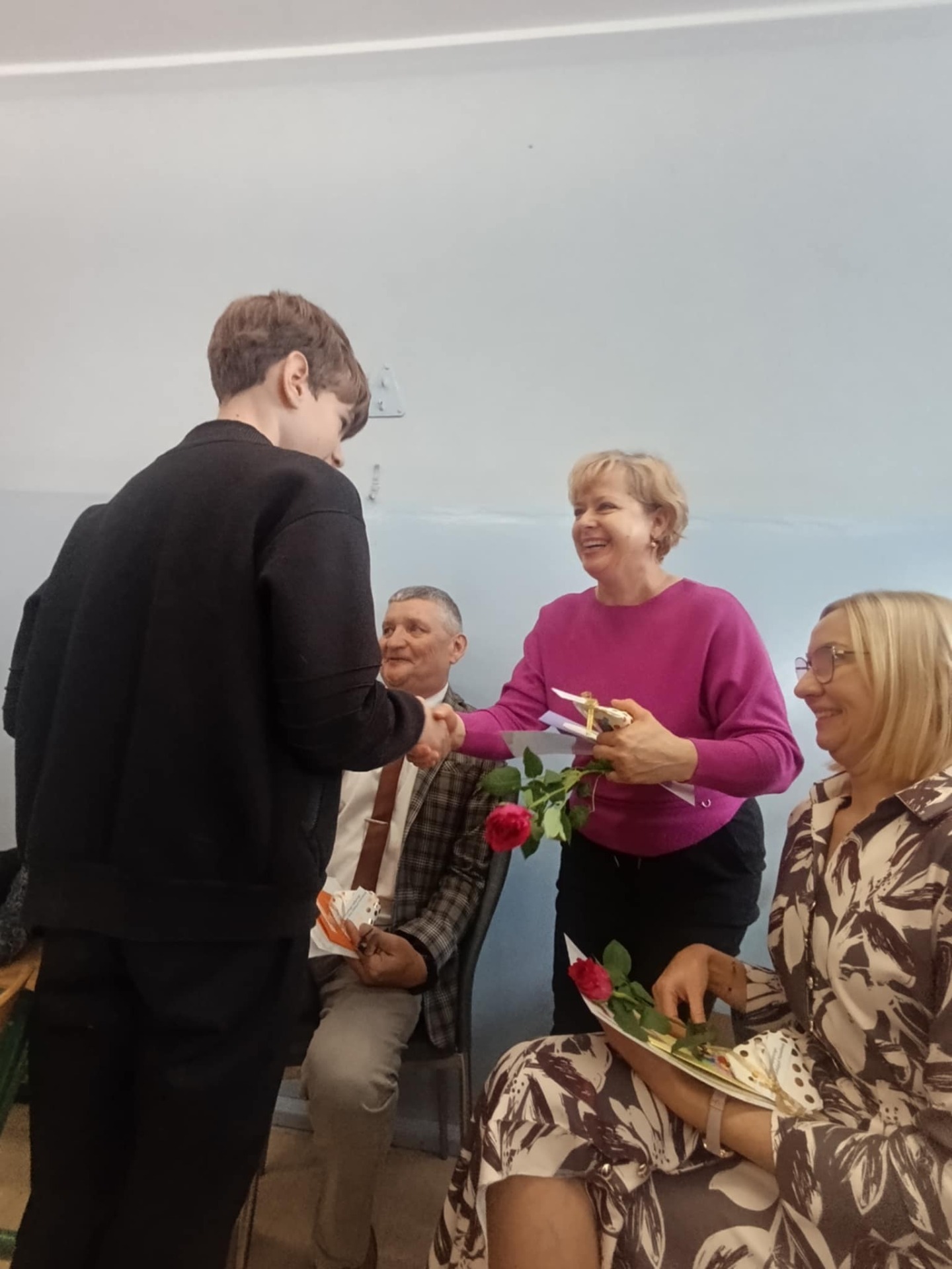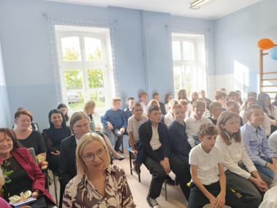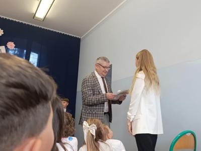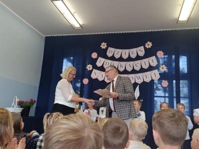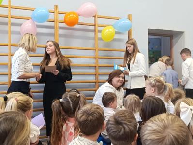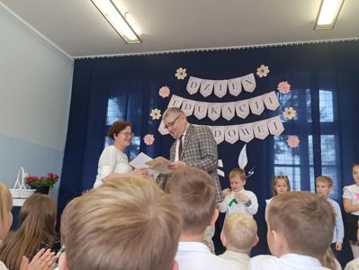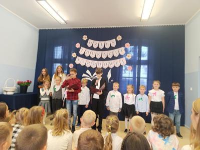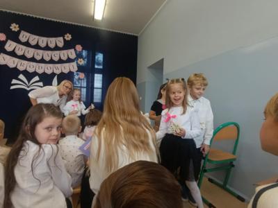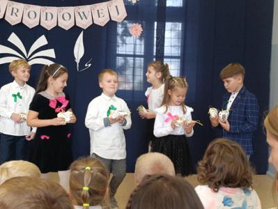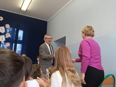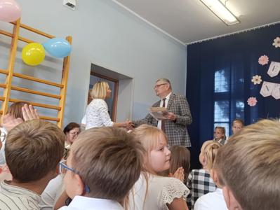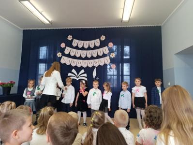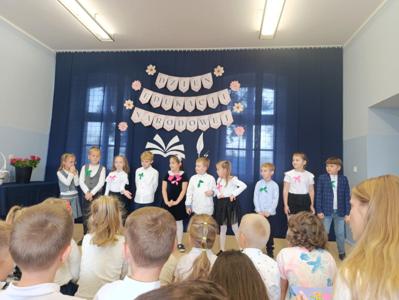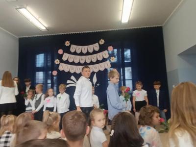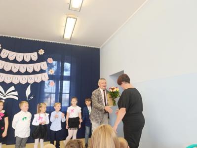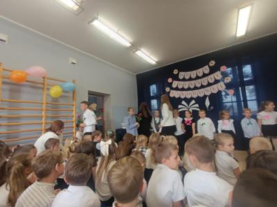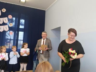 Miłym akcentem uroczystości był występ uczniów klasy pierwszej, którzy recytowali wierszyki i zaśpiewali gromkie ,,Sto lat" oraz wręczyli nauczycielom i pracownikom szkoły słodkie upominki. Po części artystycznej głos zabrał Pan Dyrektor, który złożył wszystkim pracownikom szkoły serdeczne podziękowania za zaangażowanie i trud włożony w codzienna pracę dydaktyczno - wychowawczą oraz wręczył nagrody Dyrektora. Pan Dyrektor podziękował również panu sołtysowi za owocną współpracę oraz pani Katarzynie Musiał za wieloletnie pełnienie funkcji Przewodniczącej Rady Rodziców. Na zakończenie uroczystości przedstawiciele Samorządu Uczniowskiego w imieniu Rady Rodziców wręczyli nauczycielom i pracownikom szkoły róże ufundowanie z tej okazji. Na koniec nie zabrakło wspólnego, pamiątkowego zdjęcia.