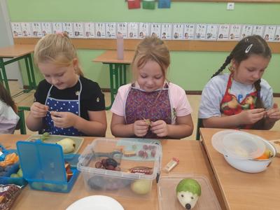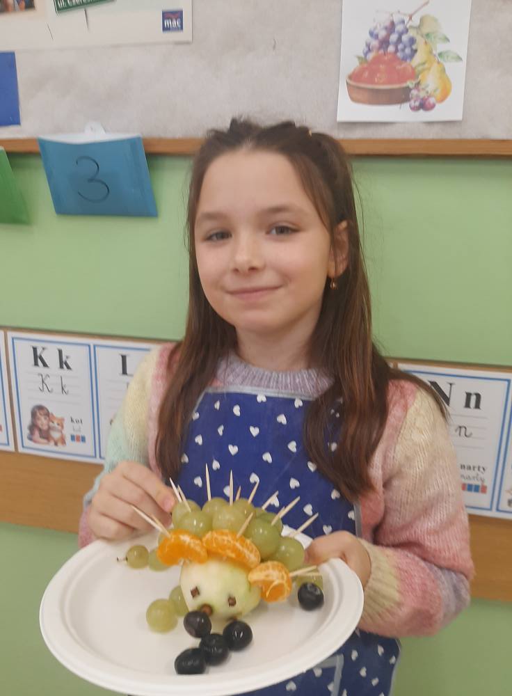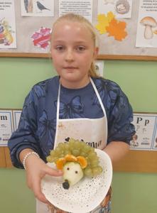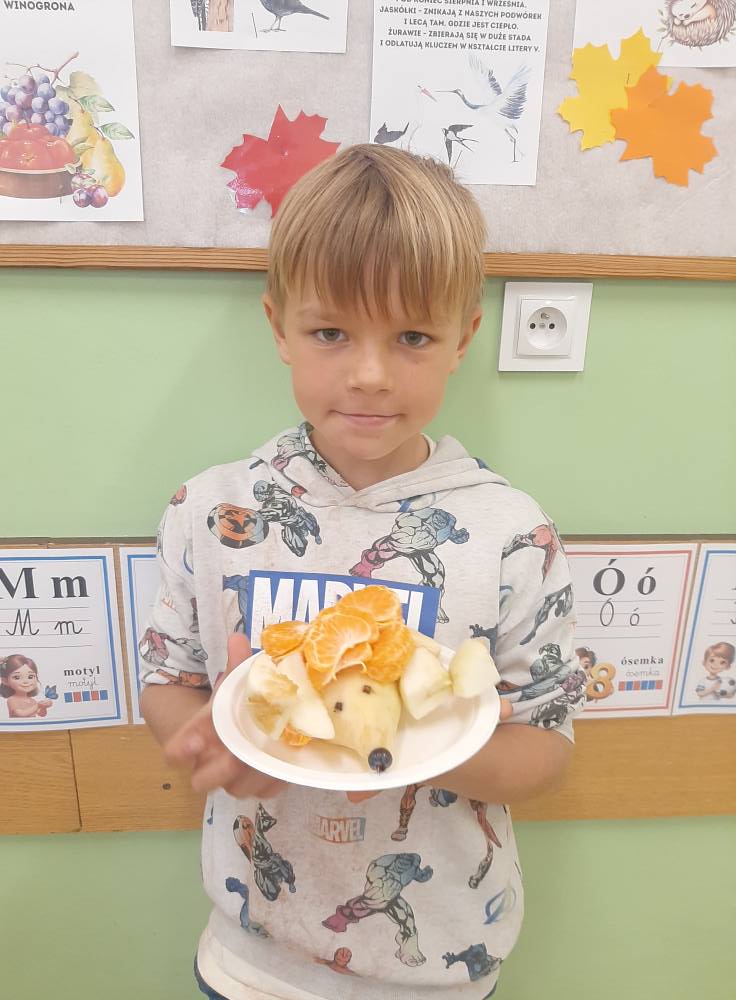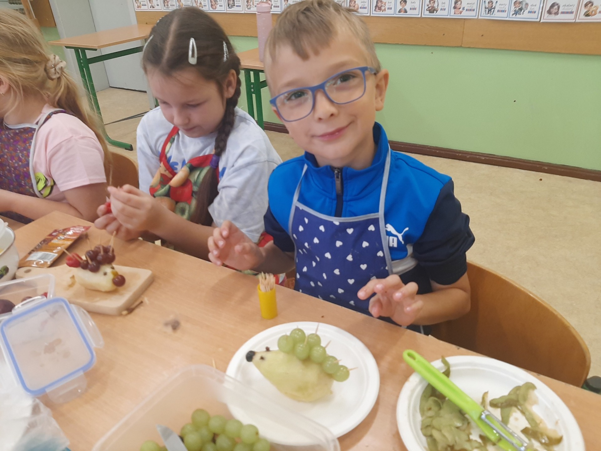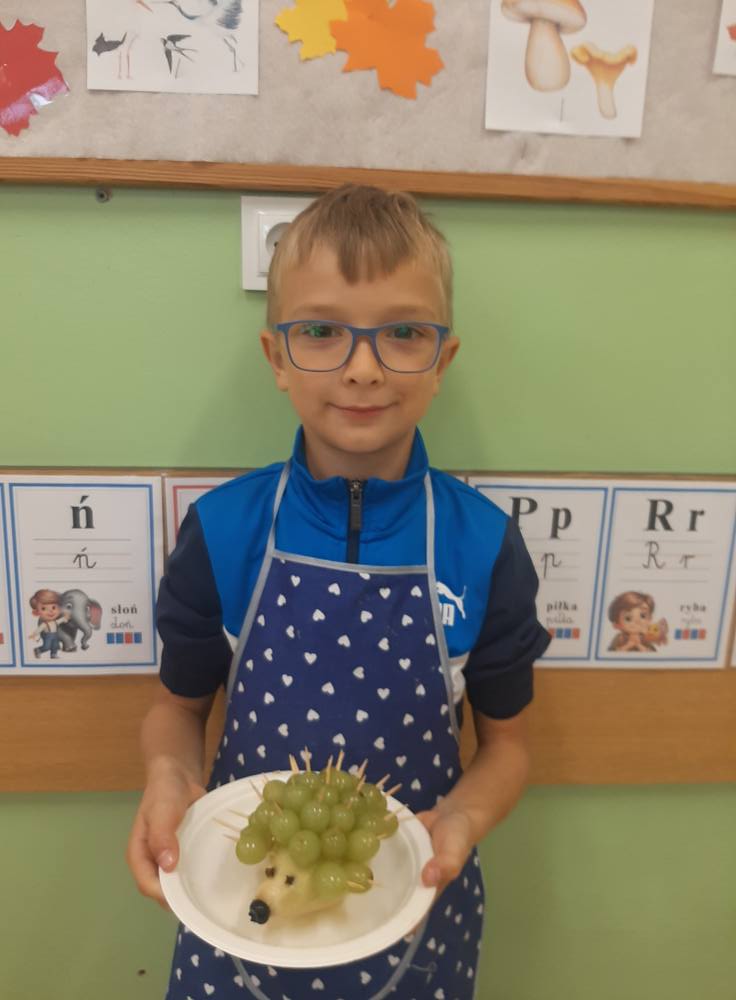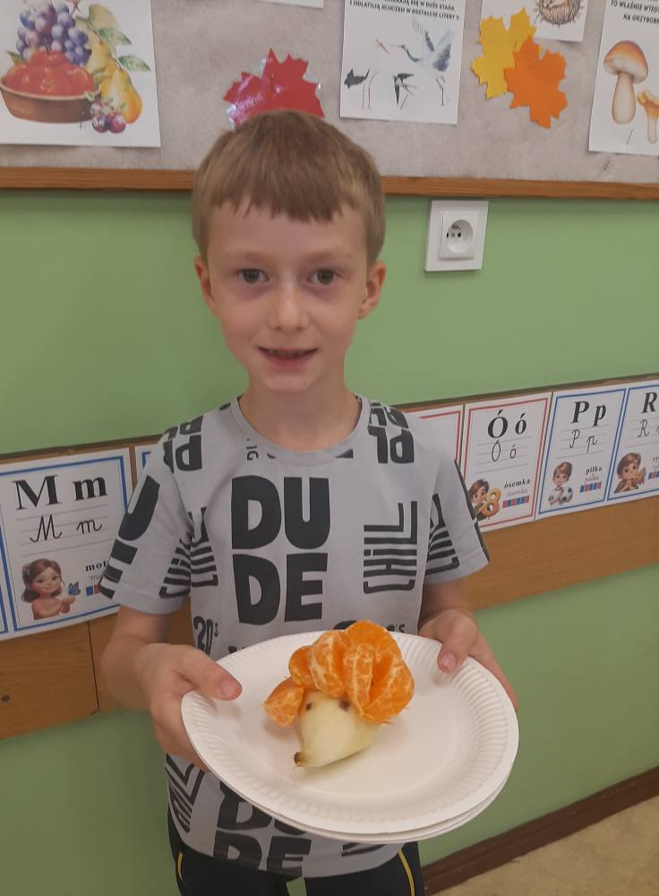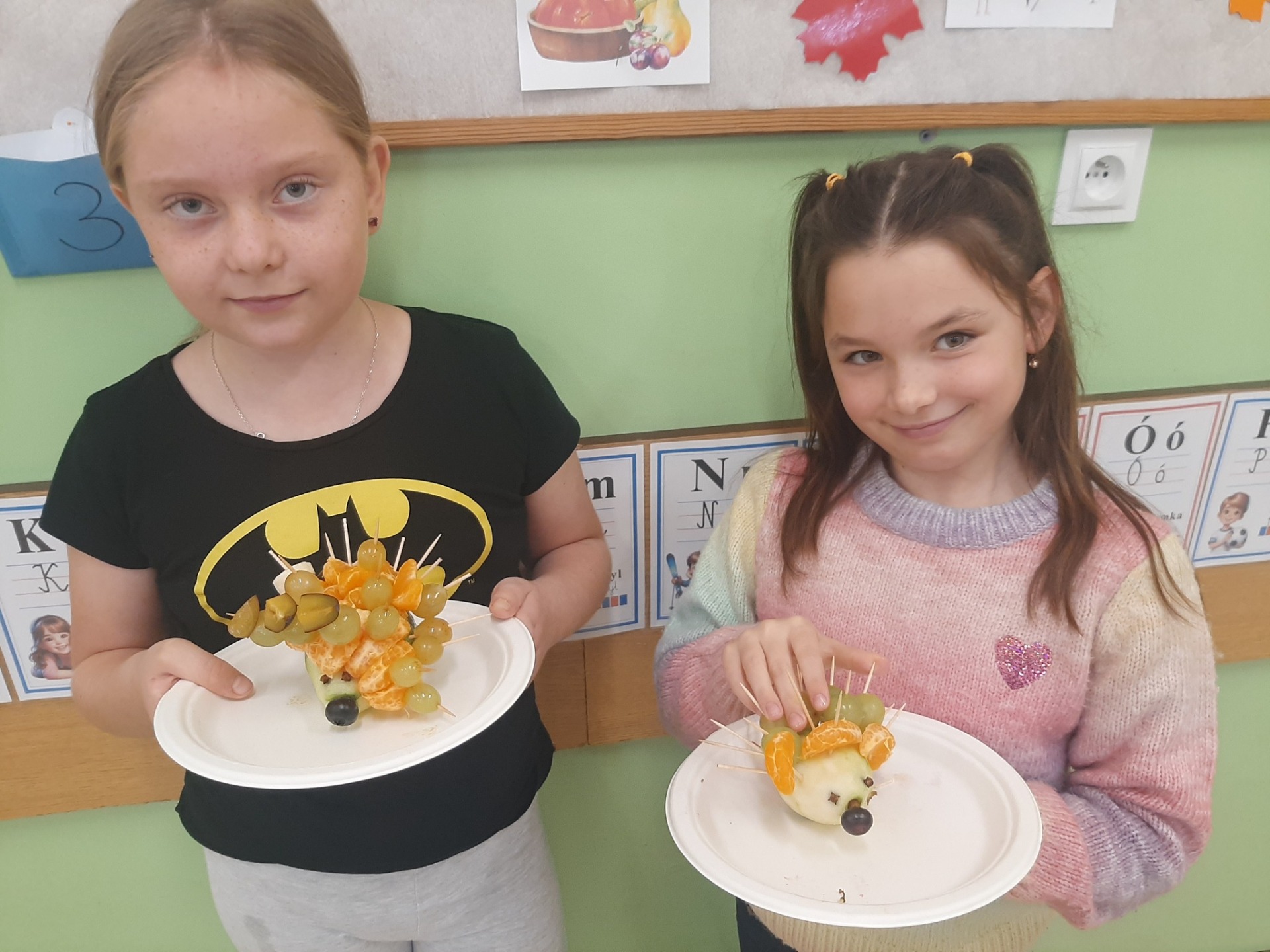 Już niedługo Dzień Owoców i Warzyw. Uczniowie klasy drugiej przygotowali smaczne i zdrowe przekąski. Samodzielnie zaplanowali etapy pracy. Tak powstały owocowe jeże.