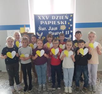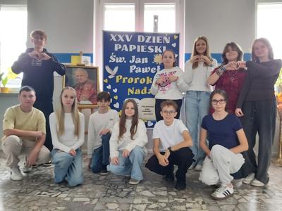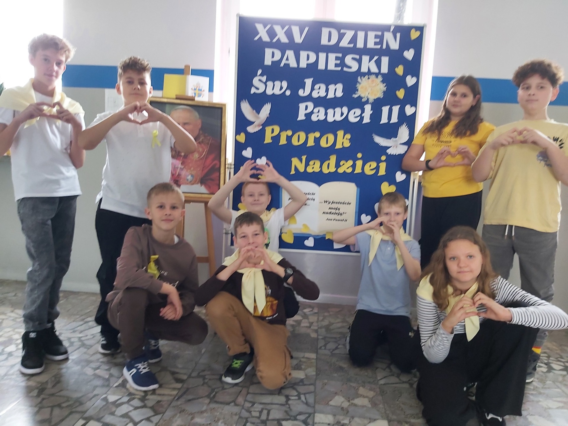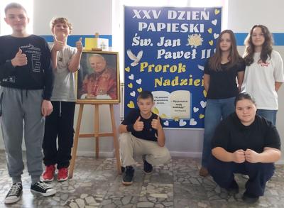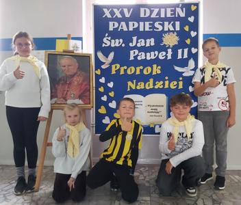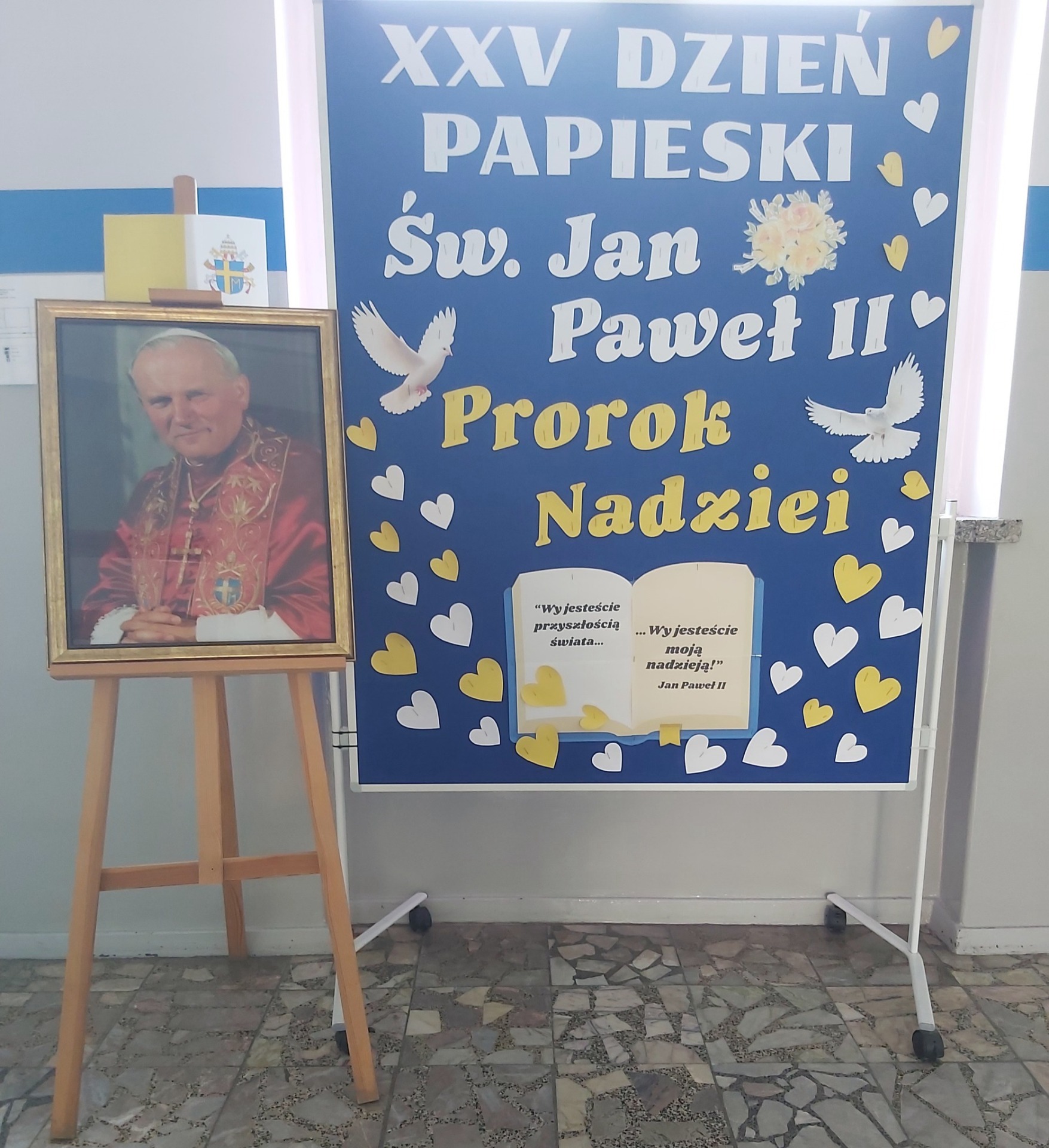w naszej szkole obchodzony był XXV Dzień Papieski. Tegoroczne hasło brzmiało: ,, Św. Jan Paweł II. Prorok Nadziei." Z tej okazji na szkolnym korytarzu przygotowana została okolicznościowa dekoracja, która stała się pięknaą oprawą do wykonania pamiątkowych zdjęć każdej klasy. Ponadto uczniowie klas 1-7 wzięli udział w różnych formach zajęć realizowanych podczas lekcji religii.