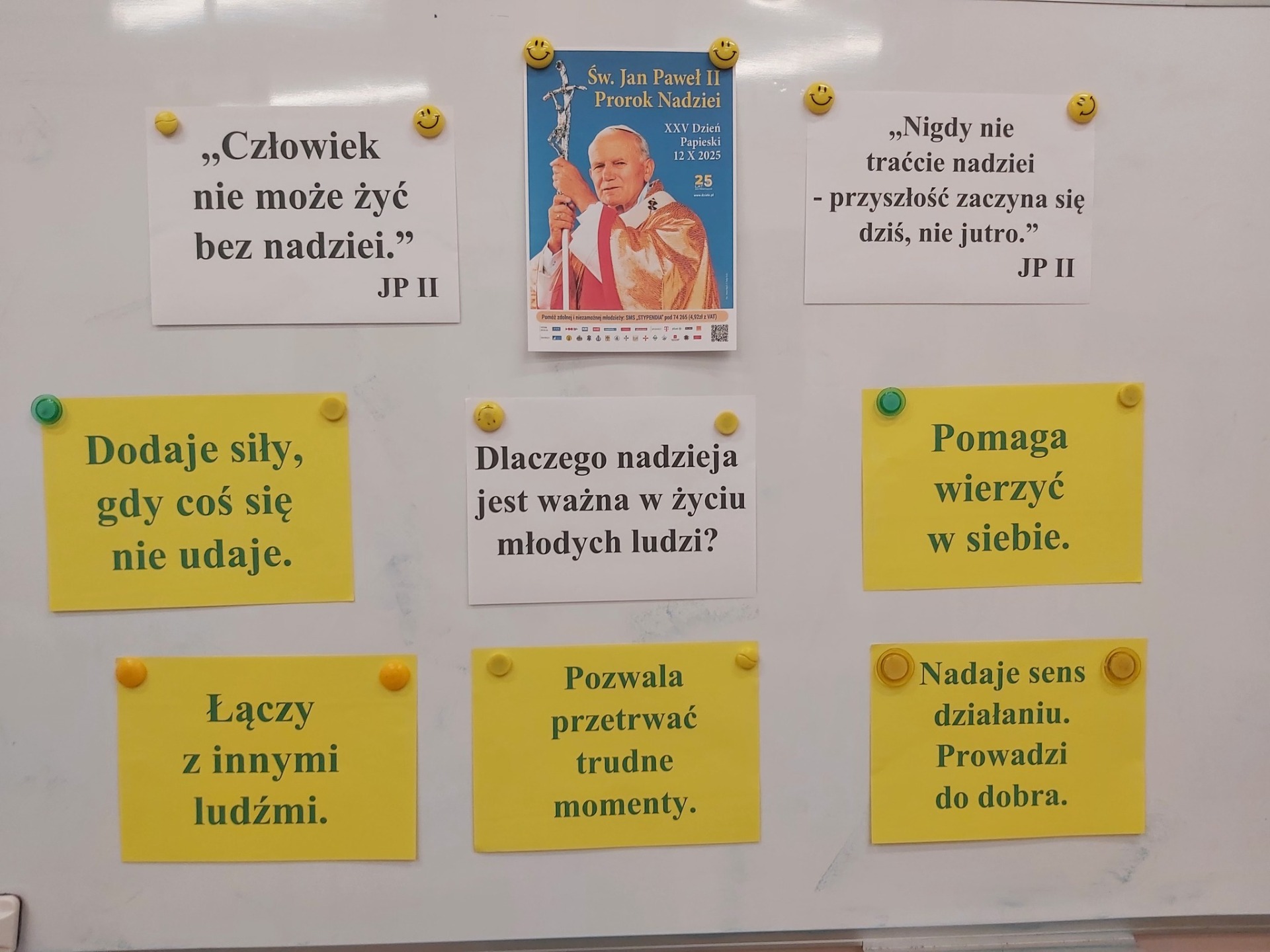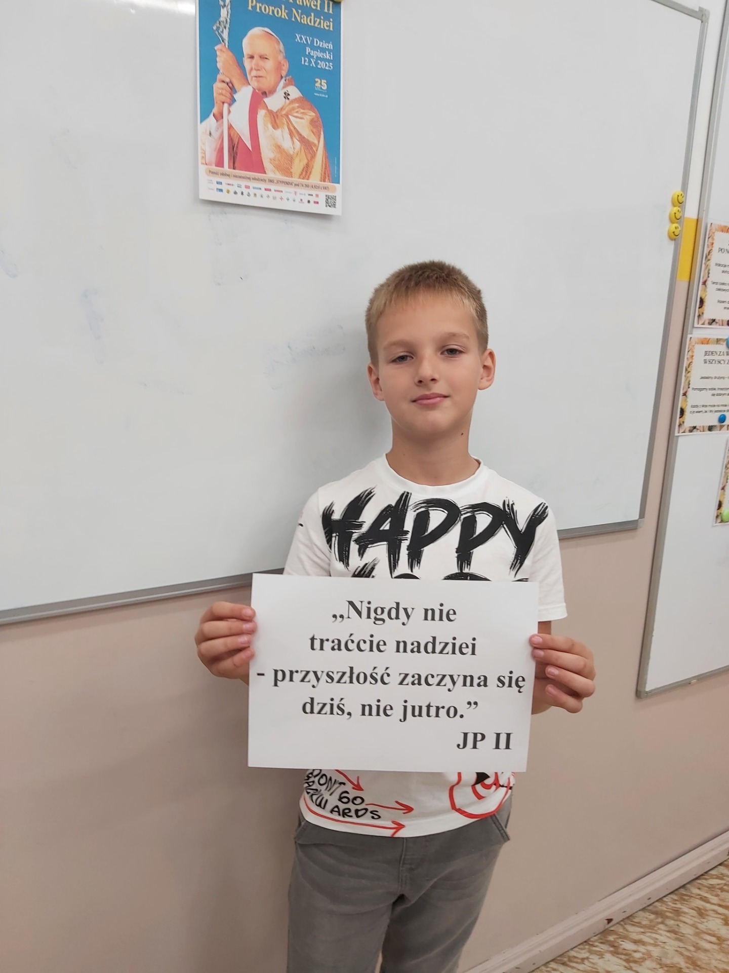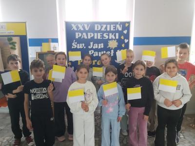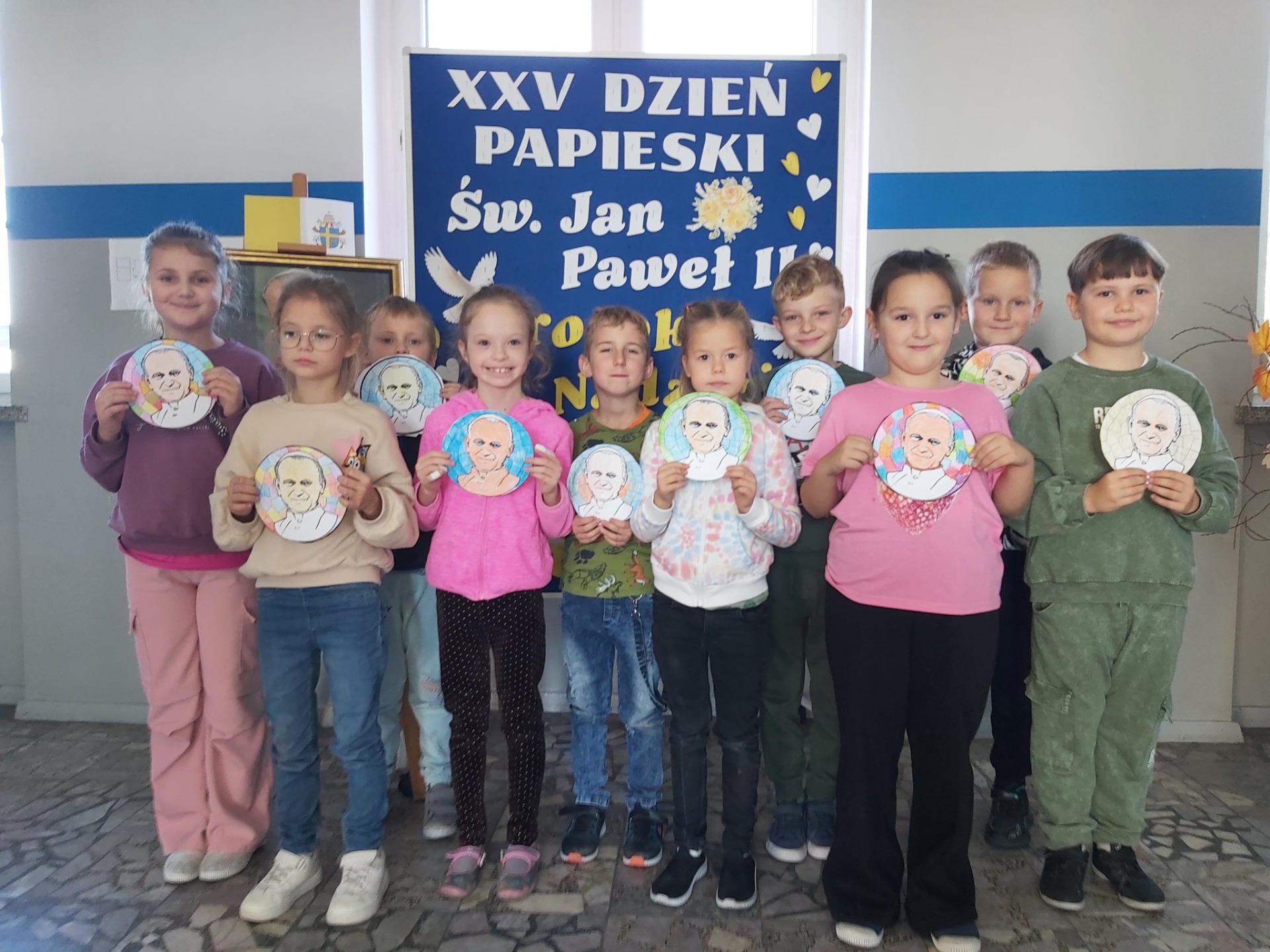 w naszej szkole obchodzony był XXV Dzień Papieski. Tegoroczne hasło brzmiało: ,, Św. Jan Paweł II. Prorok Nadziei." Z tej okazji na szkolnym korytarzu przygotowana została okolicznościowa dekoracja, która stała się pięknaą oprawą do wykonania pamiątkowych zdjęć każdej klasy. Ponadto uczniowie klas 1-7 wzięli udział w różnych formach zajęć realizowanych podczas lekcji religii.