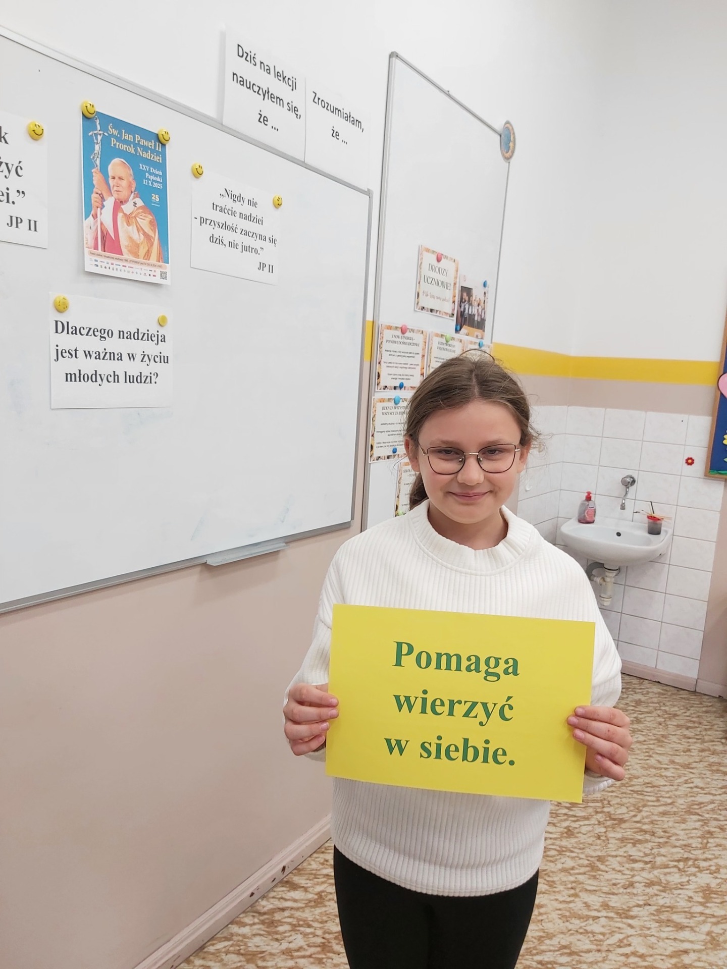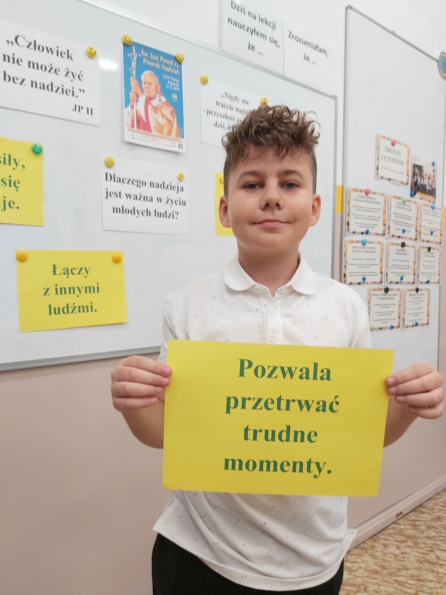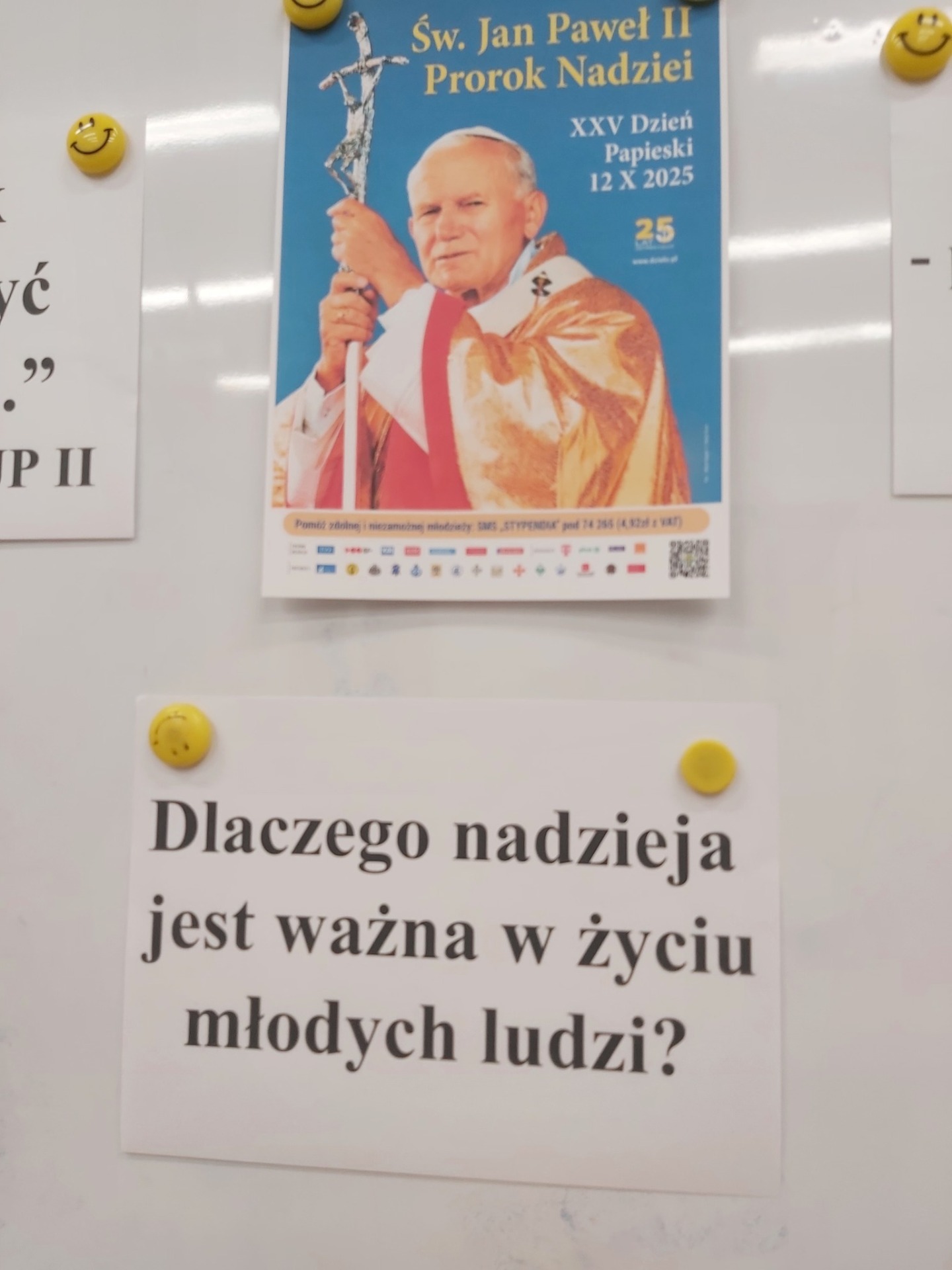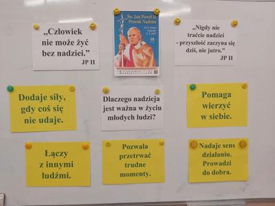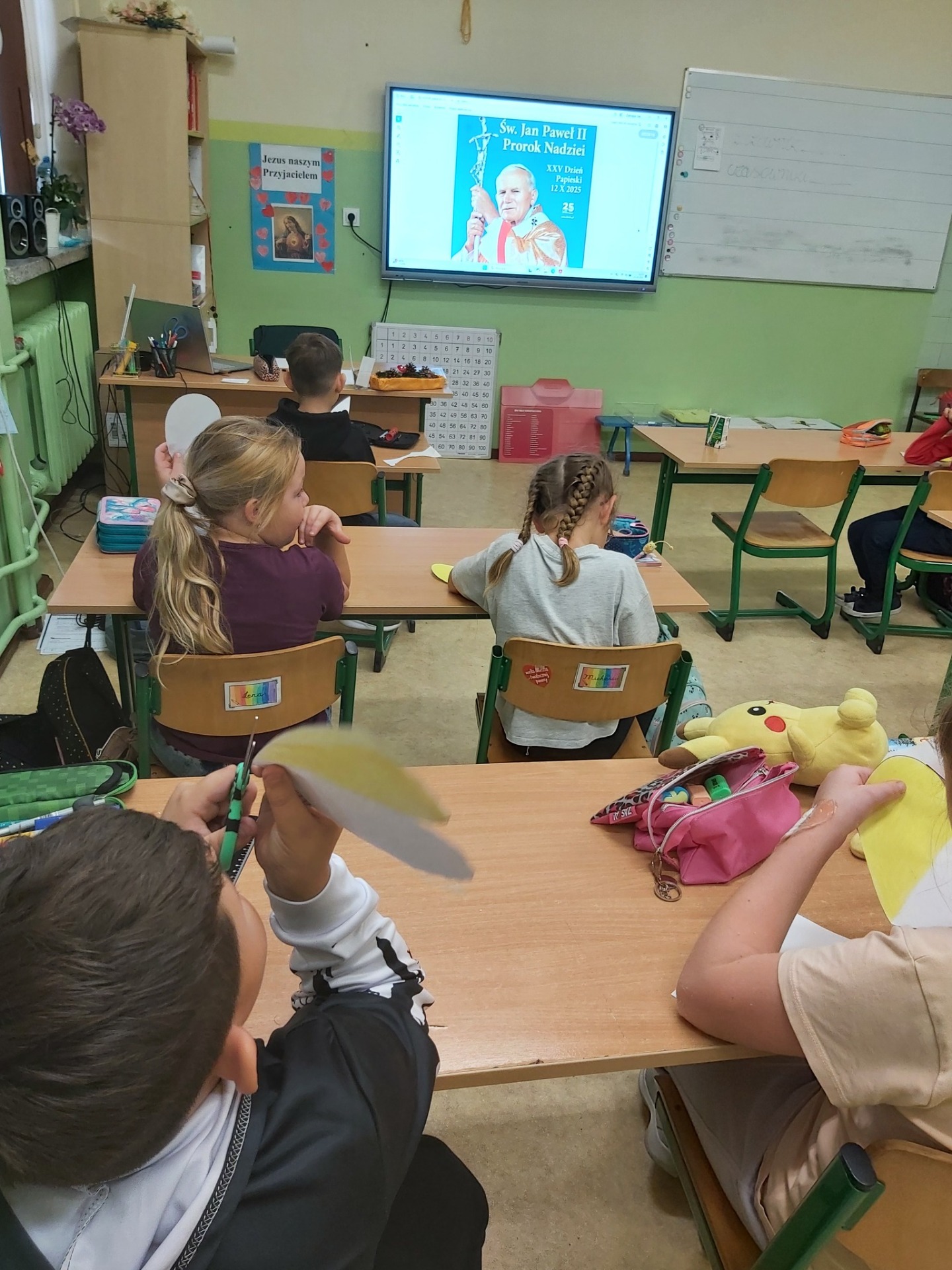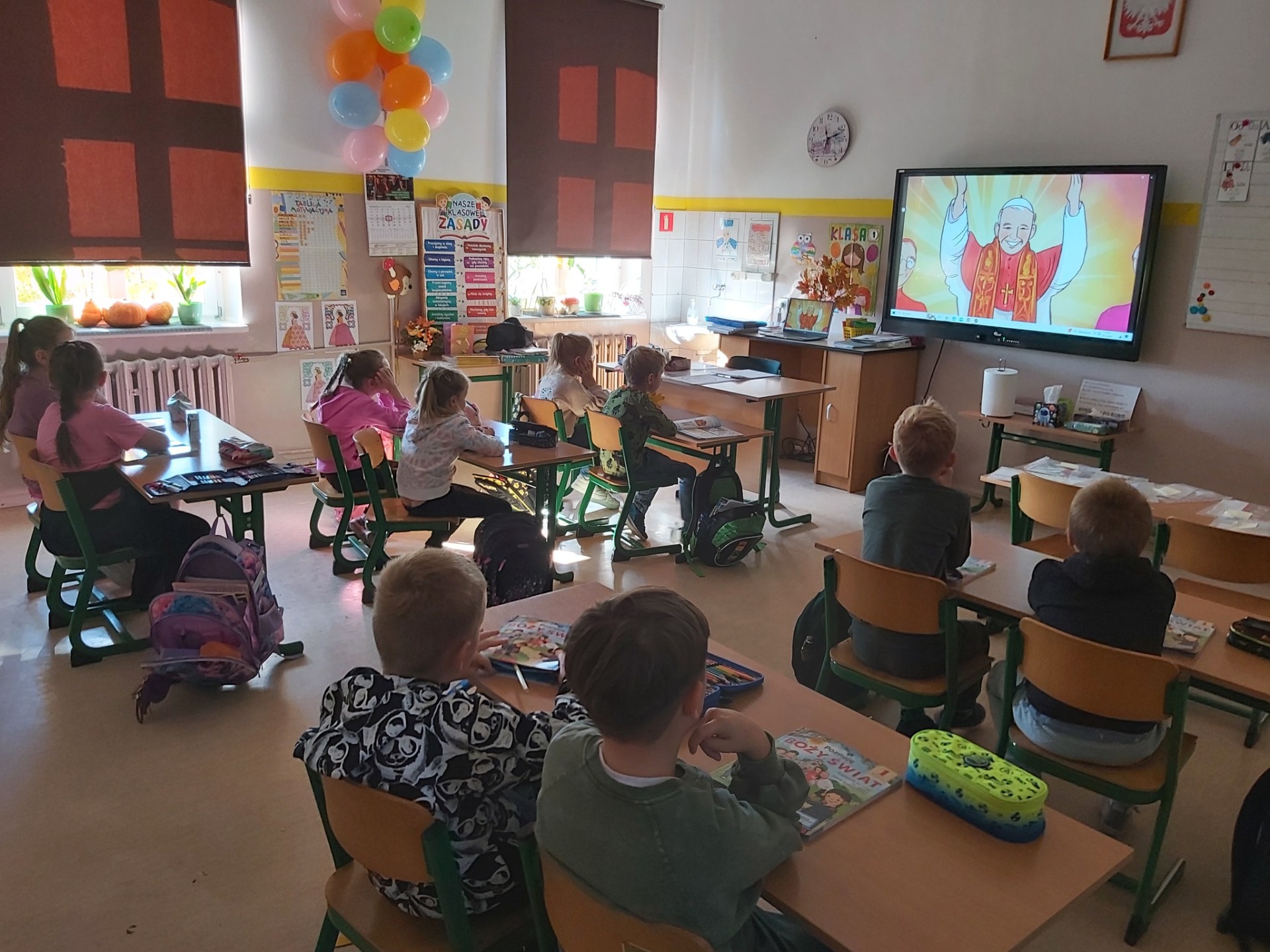 z serii ,,Aureola - od Stanisława do Karola" oraz film pt. Święty Jan Paweł II, życie Świętego Papieża, dzięki którym poznali historię życia Jarola Wojtyły, późniejszego papieża. Uczniowie klas 4-5 podjęli refleksję nad tematem nadziei w życiu młodych ludzi.